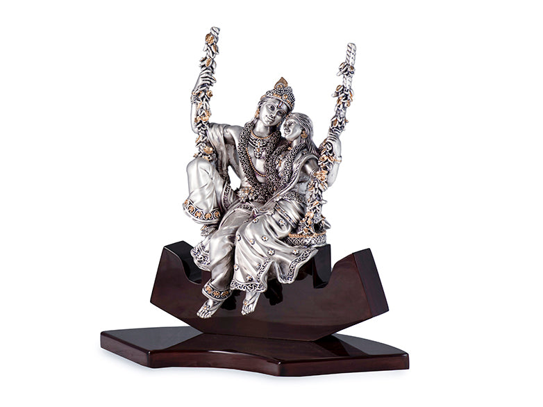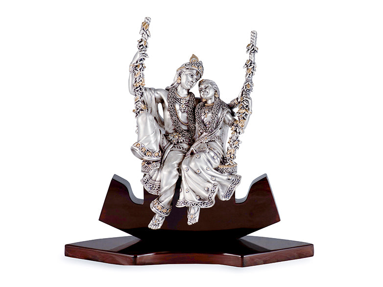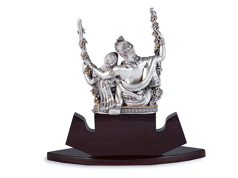 Ethereal Union is a sculpture capturing Krishna and Radha in a serene swing, radiating timeless romance and devotion. Crafted entirely in silver, every curve and detail reflects delicate artistry and a sense of fluid motion.