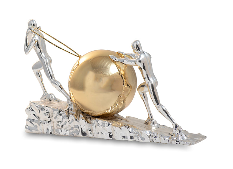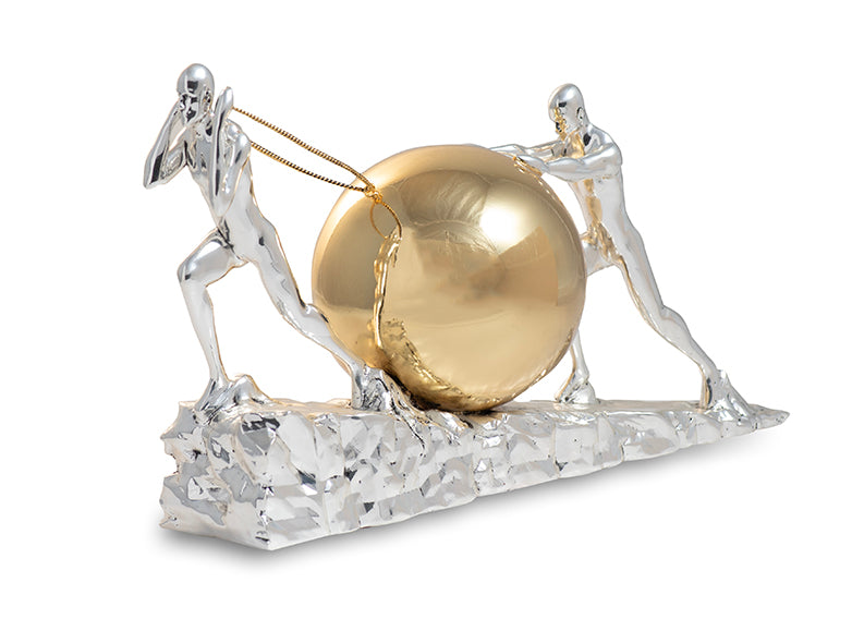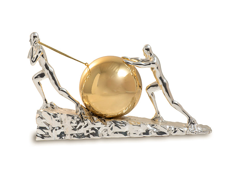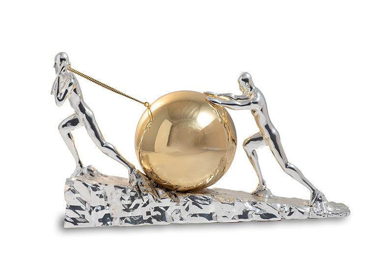 Gravitas captures the quiet strength of resilience through two stylized silver figures, unified in purpose as they carry a striking golden boulder. This sculptural showpiece speaks of balance, inner strength, and the silent determination it takes to shoulder life’s responsibilities together.