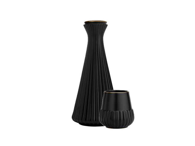 La jarra, empotrada en gres, garantiza la estética y la temperatura naturalmente fresca del agua cuando se sirve. La textura matificada realza las líneas radiantes haciendo una declaración cada vez que recibes. Un toque inconfundible lo añade el toque dorado que bordea la jarra y los vasos de agua que la acompañan.