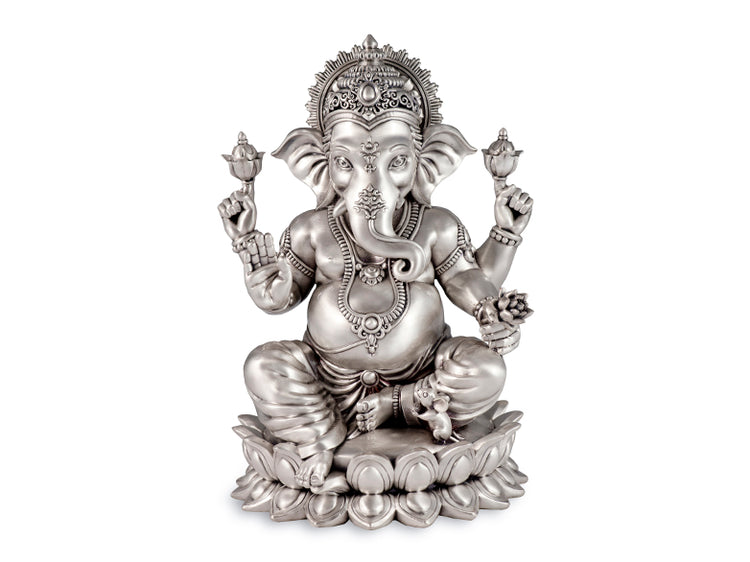 Lotus Ganesha - Satin is a silver satin Ganesha statue seated in calm majesty upon a lotus pedestal, radiating divine wisdom and auspicious grace. The silver form features intricate detailing on the crown, drapery, and beaded necklaces, reflecting masterful craftsmanship.