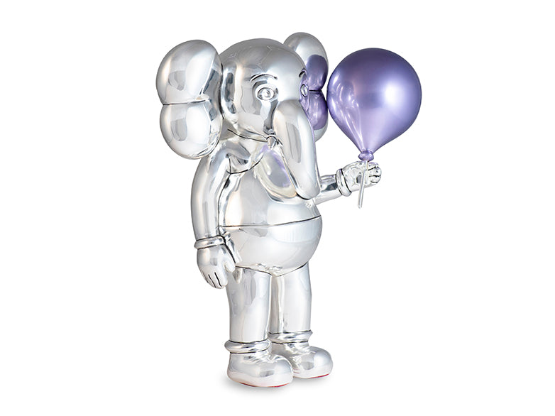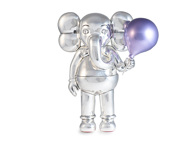 The Mauve Majesty is a whimsical elephant figurine that brings wisdom with a splash of mischief. Cast in silver chrome and holding a mauve balloon aloft, it reimagines the wiseman of the jungle with a pastel pop of personality.