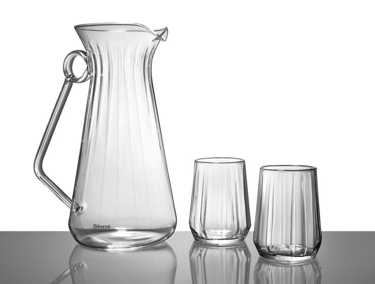 Inspired by the river that never runs dry, the glass water jug comes with a full capacity to ensure multiple rounds of water is served. Designed with a sturdy base and ergonomic handle, pouring from a carafe this large is as easy as it gets. The carafe is accompanied with two water drinking glasses with a design to compliment.