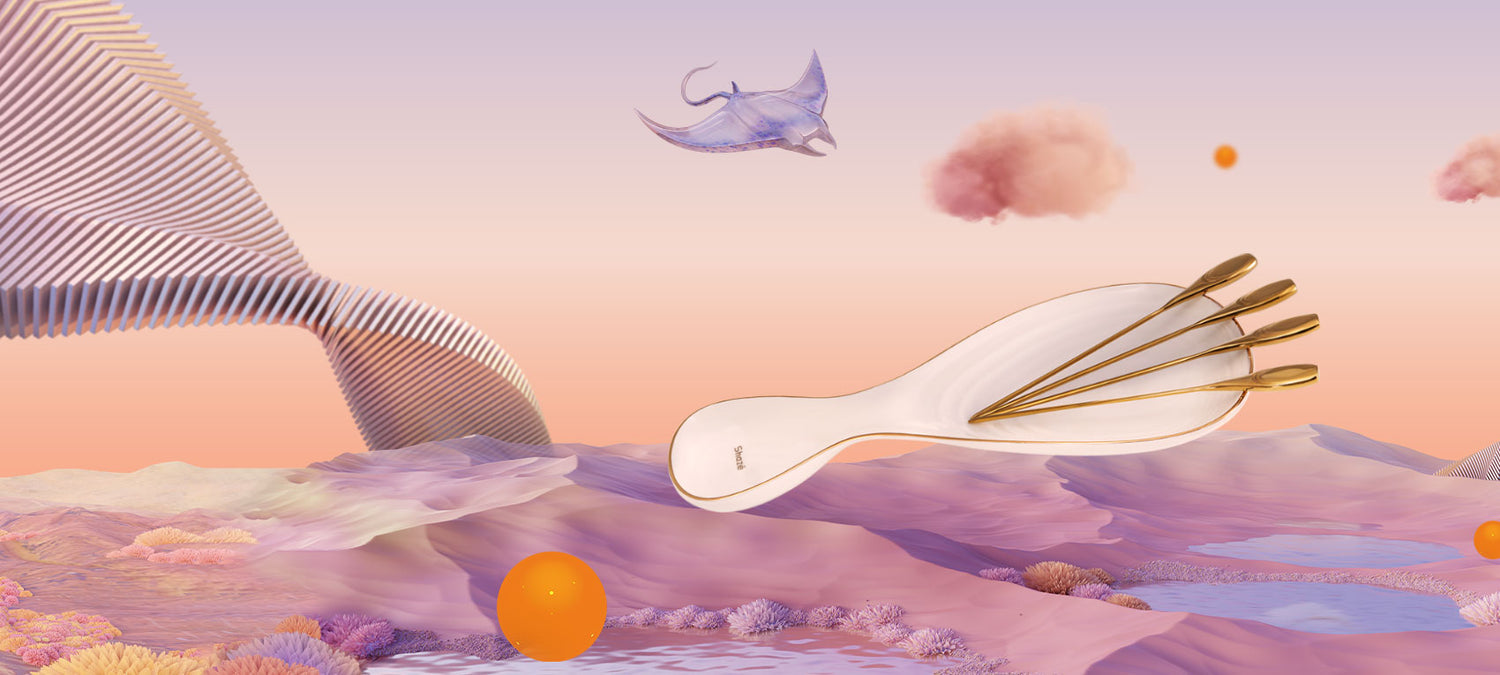 A hosting must-have that floats the boat with its nautical form, ergonomic design, and muted flamboyance. This porcelain platter’s appetizer cavity, attached dip cavity, and four oar-like, gilded skewers, are a complete plating delight.
