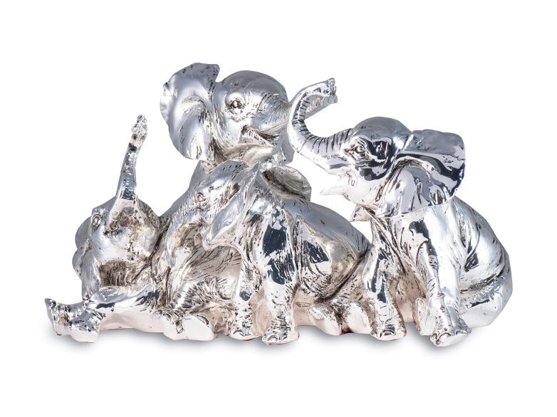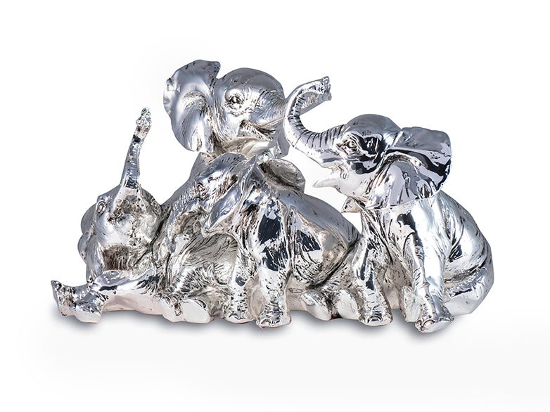 Tusklets is an elephant figurine that captures playful charm in polished silver. Featuring four baby elephants mid-frolic, this silver-toned animal idol is a joyful celebration of connection and innocence in luxury decor.