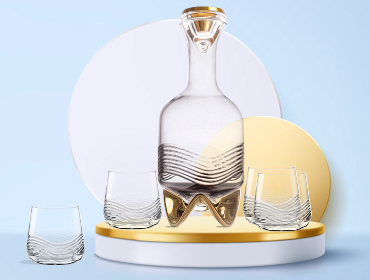 A whisky set comprising of a decanter and whisky drinking glasses. The clear-cut glass decanter is designed for the true whisky aficionado. The glass frame allows you a window to appreciate the whisky’s colour and clarity – speaking volumes of its legacy. The wide rim of the glass is perfected for a whisky drinking experience – giving ample space for the first whiff of alcohol to settle and welcomes you to a full, flavourful sip.