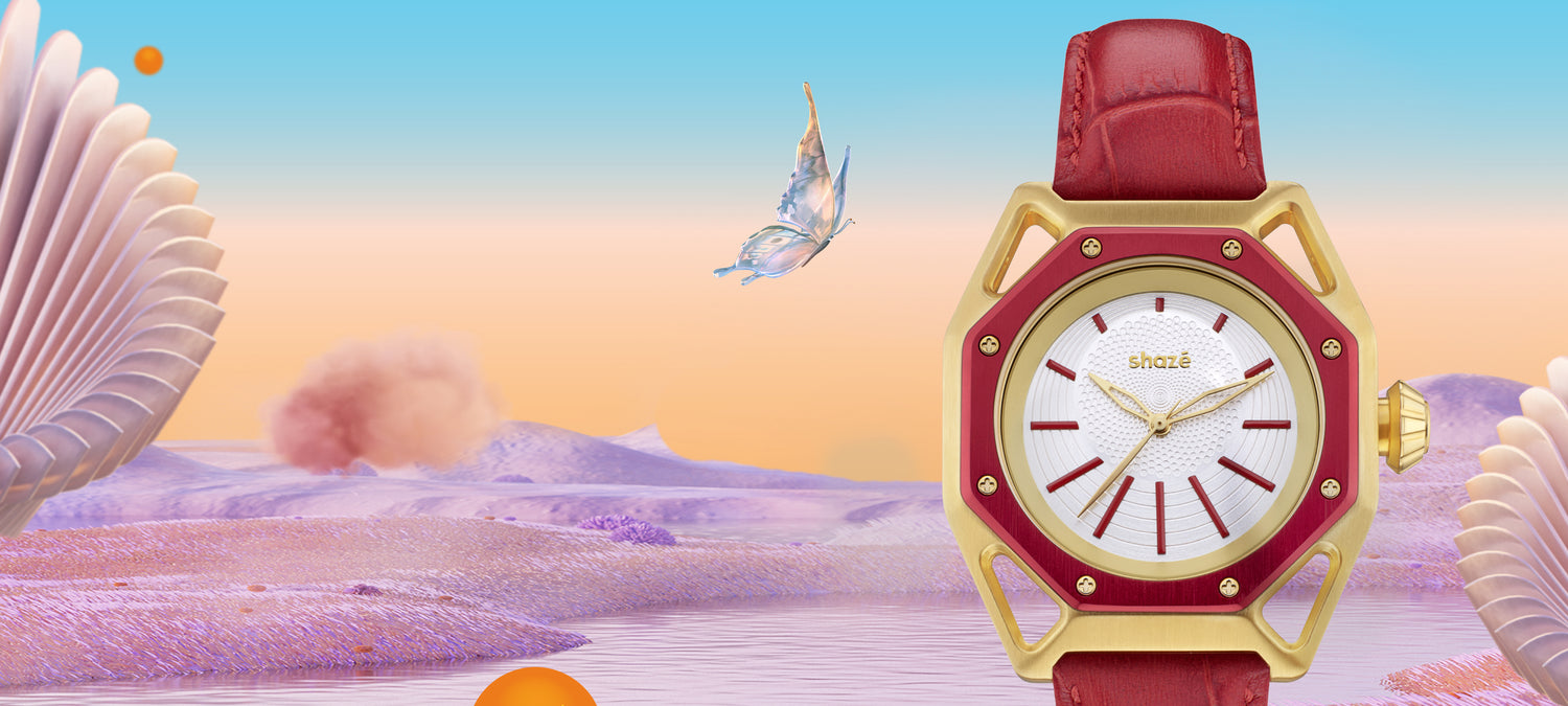Semer une histoire à travers les éléments célestes affichés sur les cadrans dramatise le look de ces engrenages à main. Avec un design unique à Shazé, des attaches fabriquées avec précision définissent le boîtier de la montre.