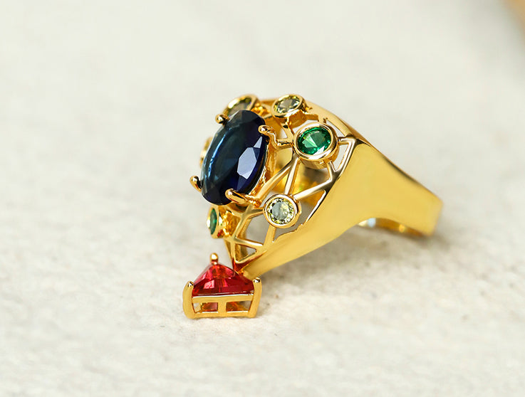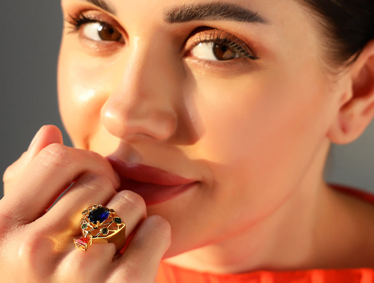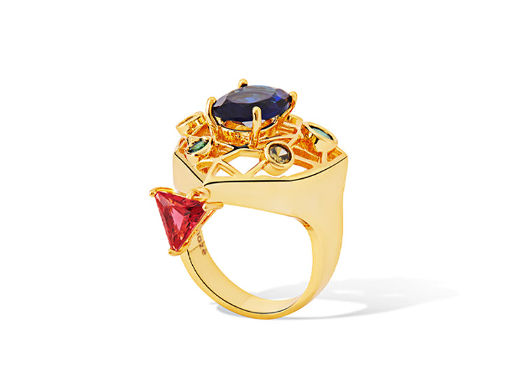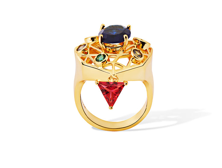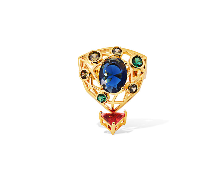 The ring reflects the precision of European design, giving emphasis to the meticulously detailed form crafted in 18K gold plating. Fire-birthed stones nurtured and arranged with confident precision against the architectural form echoes the Victorian inspiration. More than an accessory, the Garth Golden Ring is a modern heirloom, bearing the distinctive Shazé design signature. The un-seen piece is designed for statement ensembles.