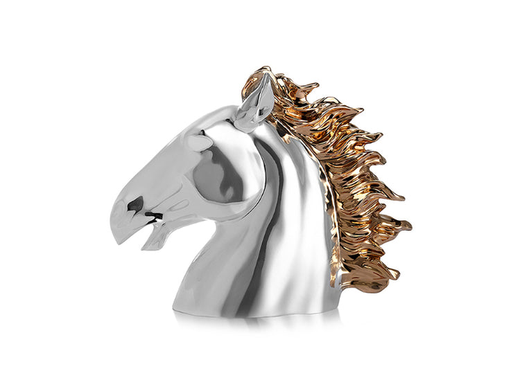 Les détails de la crinière mettent en valeur avec précision les magnifiques traits de la tête du cheval. L’utilisation de l’or rose symbolise la verve d’une jeunesse audacieuse. Moulé à la perfection et argenté, le design raconte une histoire que tout motif équestre souhaite raconter.