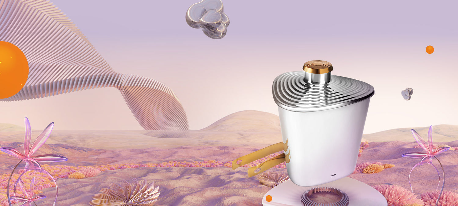 L'acier inoxydable brossé, dessiné dans la forme trichoïde signature de Shazé, forme le seau extérieur. Conçu avec des perforations sur de l'acier filé, vous laisse planer et sécher sur glace. Les pinces cueillent astucieusement deux glaçons simultanément.