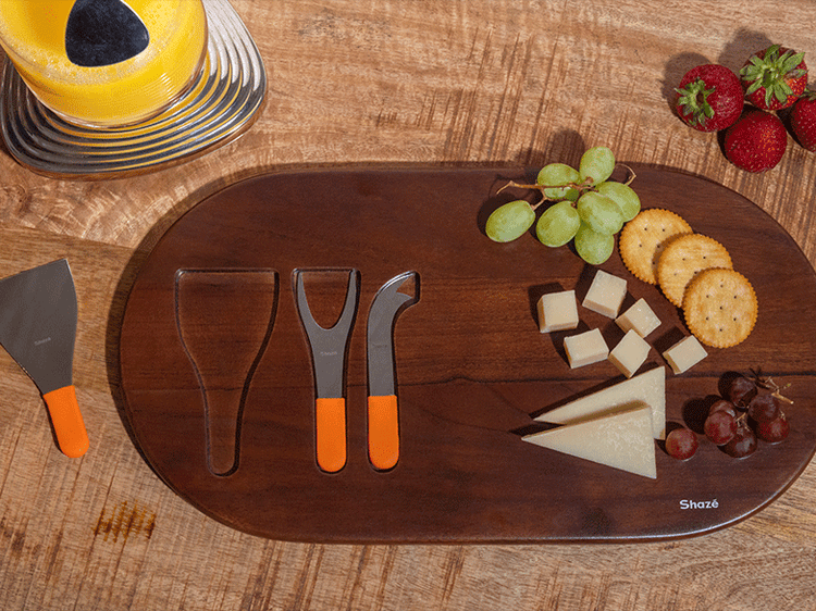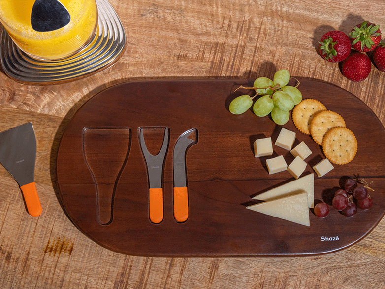Le bois d'acacia moulu forme ce plateau robuste avec son dos à motifs. L'acier inoxydable sert l'équipement spécialisé – une fourchette à fromage et deux couteaux. Sécurisez votre maintien grâce à leur doublure en silicone.