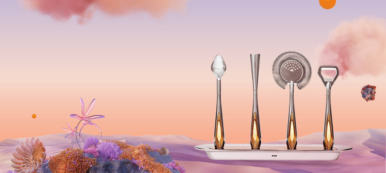 Cet ensemble ergonomique comprend un agitateur, une passoire Hawthorne, un pilon et un décapsuleur. Chacun a une tête en acier inoxydable de qualité alimentaire et une poignée lestée en or avec une extrémité arrondie pour s'insérer dans la rainure correspondante.
