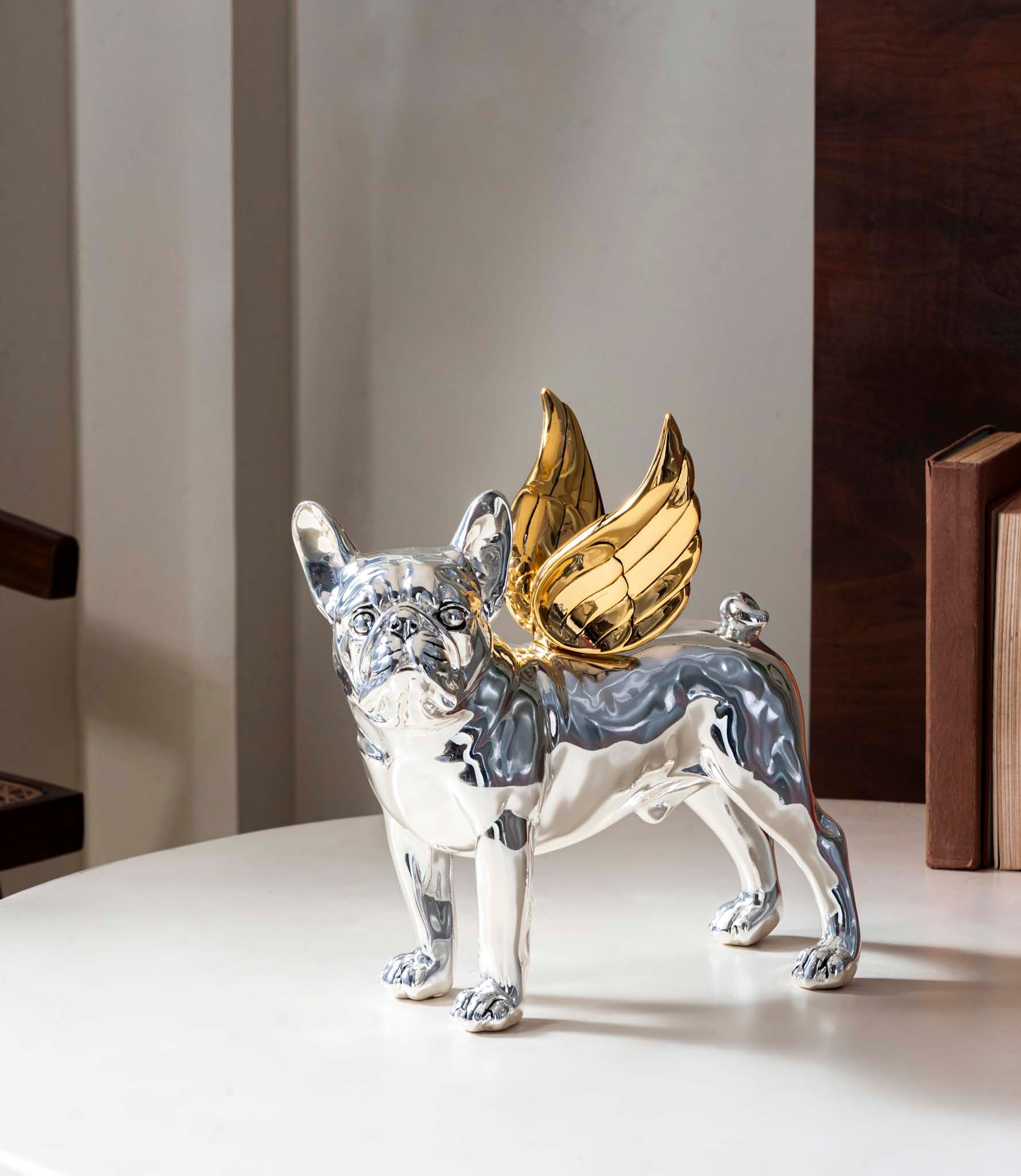 Chrome Edition takes flight with Winged Watcher, crafted for luxury home decor. This chrome-finished French Bulldog stands poised with unmistakable canine confidence and a sharp, modern edge.