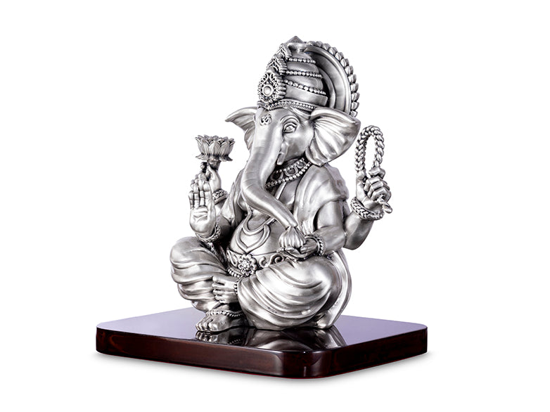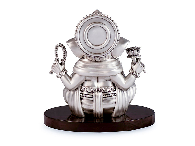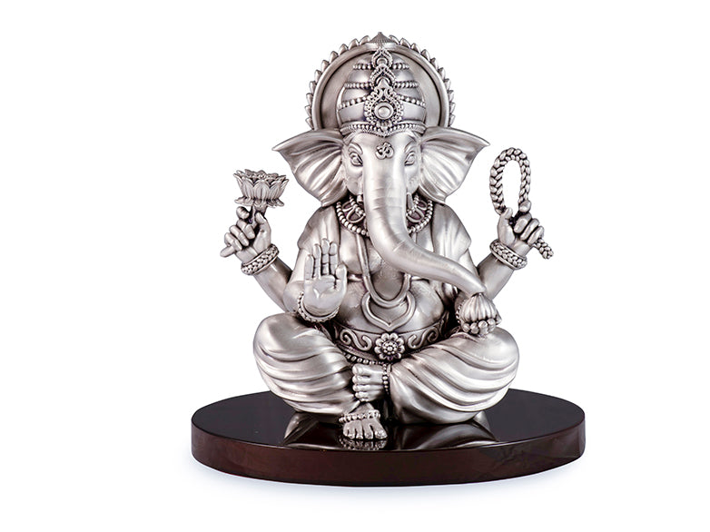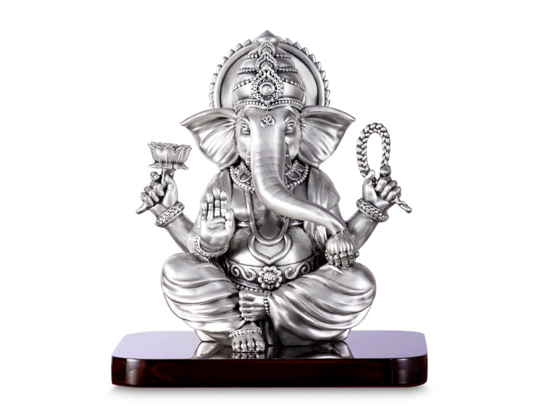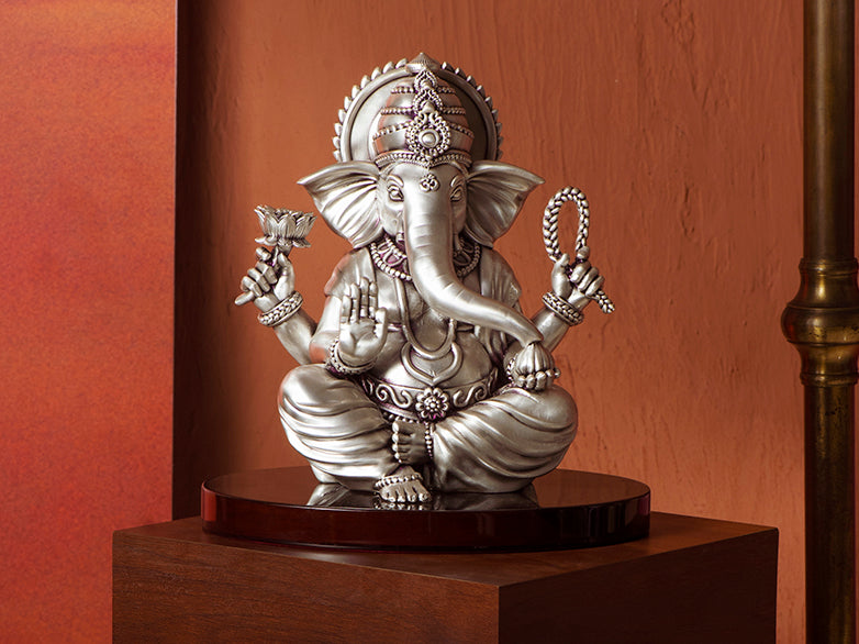 Bless is a satin finish Ganesha statue that embodies calm strength and divine presence. Seated gracefully, the intricate detailing of his crown, ornaments, and symbolic attributes highlights masterful artistry, while the silver satin sheen adds subtle elegance.