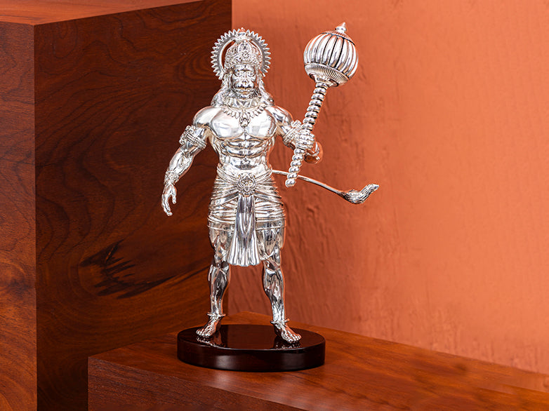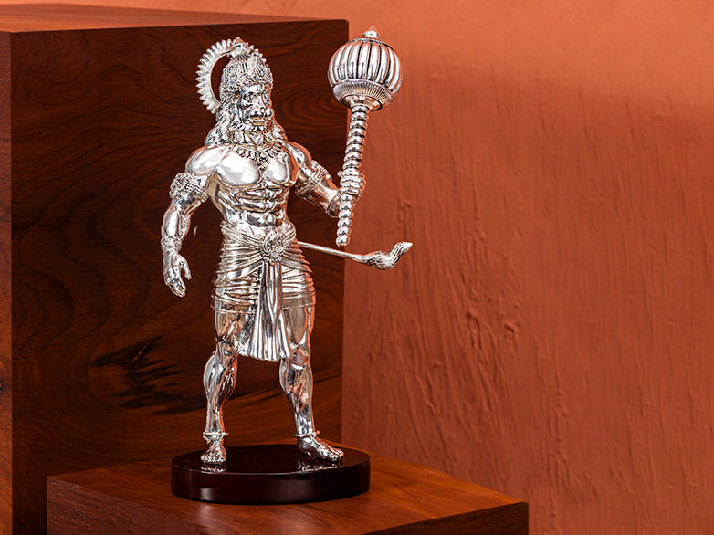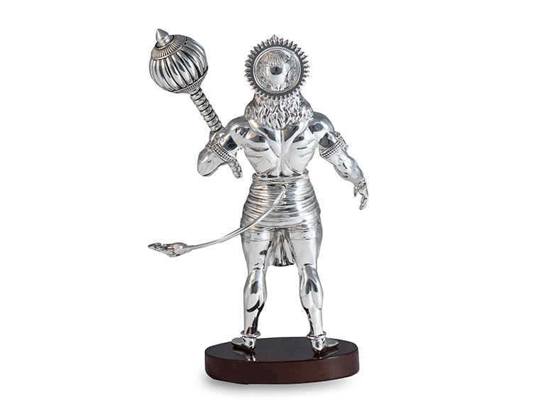 Set on a lacquered wooden base, this silver chrome Hanuman idol serves as spiritual Hanuman decor or a decorative Hanuman statue, perfect for modern living spaces. Ideal as thoughtful housewarming gift items, Boundless is a timeless tribute to courage, loyalty, and fearless devotion, reminding all who see it of the strength in protecting and serving with heart.