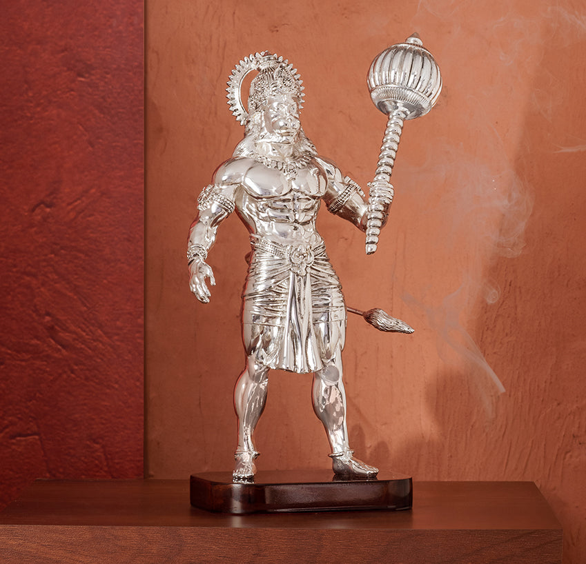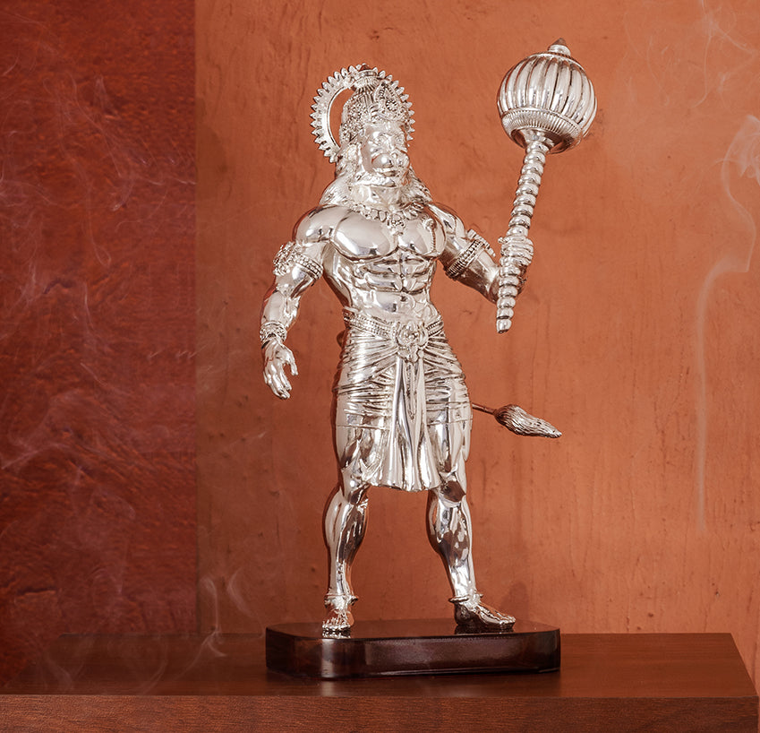 Set on a lacquered wooden base, this silver chrome Hanuman idol serves as spiritual Hanuman decor or a decorative Hanuman statue, perfect for modern living spaces. Ideal as thoughtful housewarming gift items, Boundless is a timeless tribute to courage, loyalty, and fearless devotion, reminding all who see it of the strength in protecting and serving with heart.