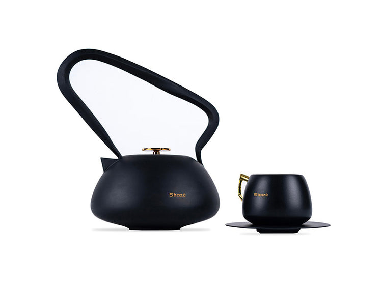 A sleek rendition of the brewing tea pot, Cha by Shazé features a matte black finish and an accent handle for an easy pour. Bringing friends and the design together are complimenting tea cups that come as part of this teapot set.
