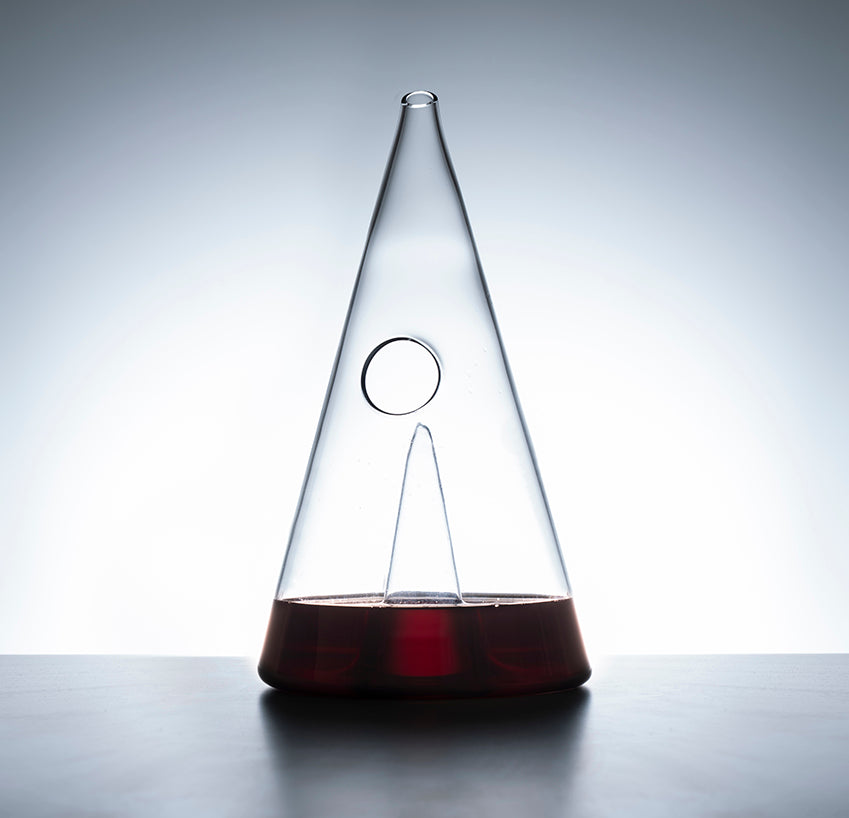 A conical-shaped glass decanter,‘Conical Swirl’ is crafted to enhance red wine through movement and air. The inset cone cavity promotes smooth aeration and a natural swirl as the wine flows. A side opening on the body of the cone allows pouring directly from the bottle, while the top aperture enables a controlled pour into the glass. A seamless balance of form, function, and design.