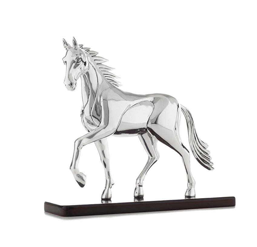 ‘Continuum Stallion’ reinterprets motion through a minimalist sculptural lens, capturing the dynamic spirit of a galloping horse. Natural musculature is translated into fluid, loop-inspired contours that merge seamlessly, creating rhythm, structure, and movement within stillness. Finished in polished silver chrome and mounted on a wooden base, the form reflects light with precision, accentuating each refined transition. A poised expression of power, freedom, and modern craftsmanship.