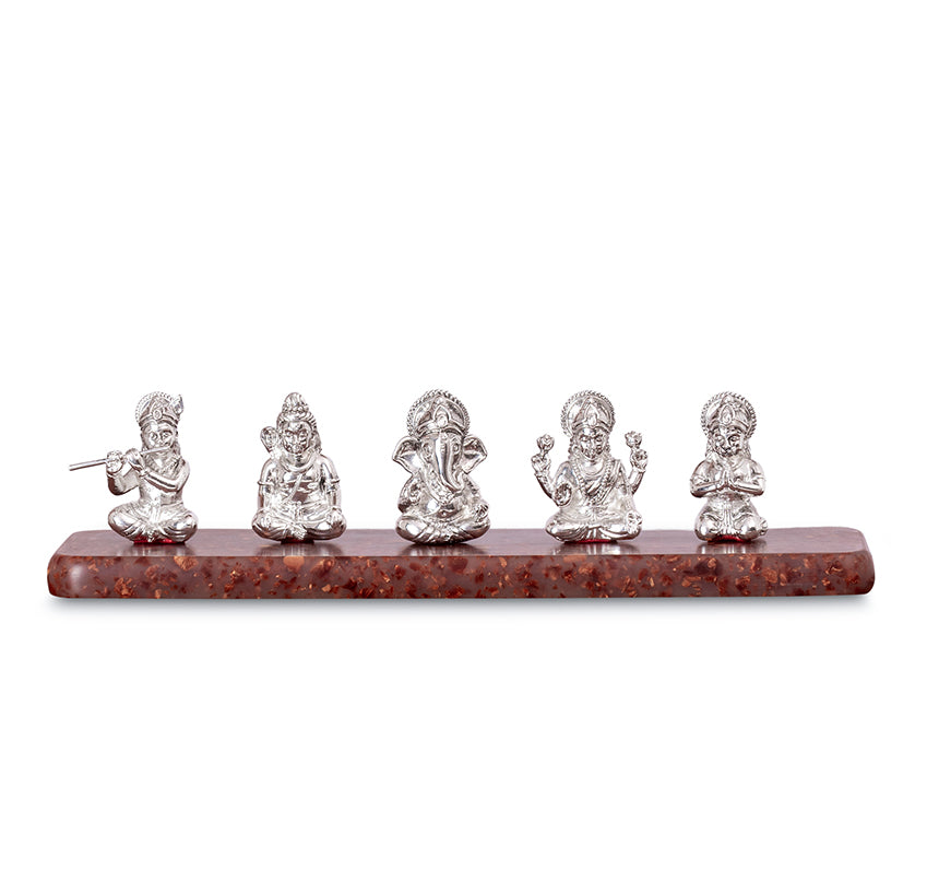 "‘Fivefold Harmony’ is a mini set that brings together the 5 gods- Krishna, Shiva, Ganesha, Lakshmi, and Hanuman, each reimagined with softened, rounded forms that give the sacred icons a playful yet elevated character. Their polished, reflective finish amplifies every curve, catching light beautifully to highlight the sculptural detailing and modern contours. Unbound from the stone base, the five figures can be arranged your way, turning everyday ritual into a personal design moment. A compact, expressive quintet that blends devotion with contemporary artistry."
