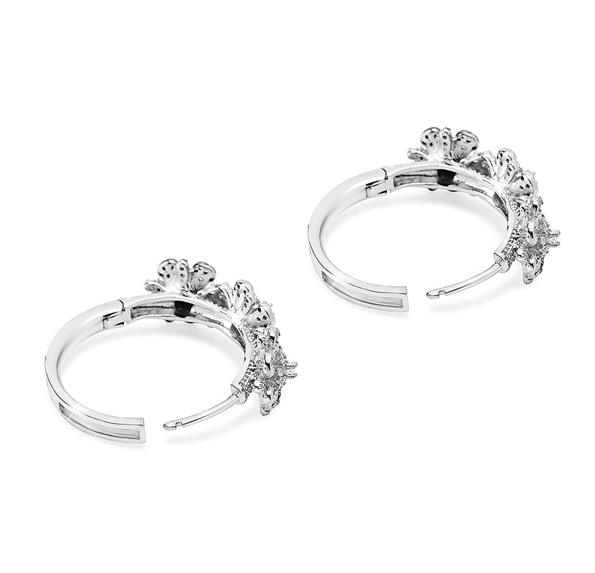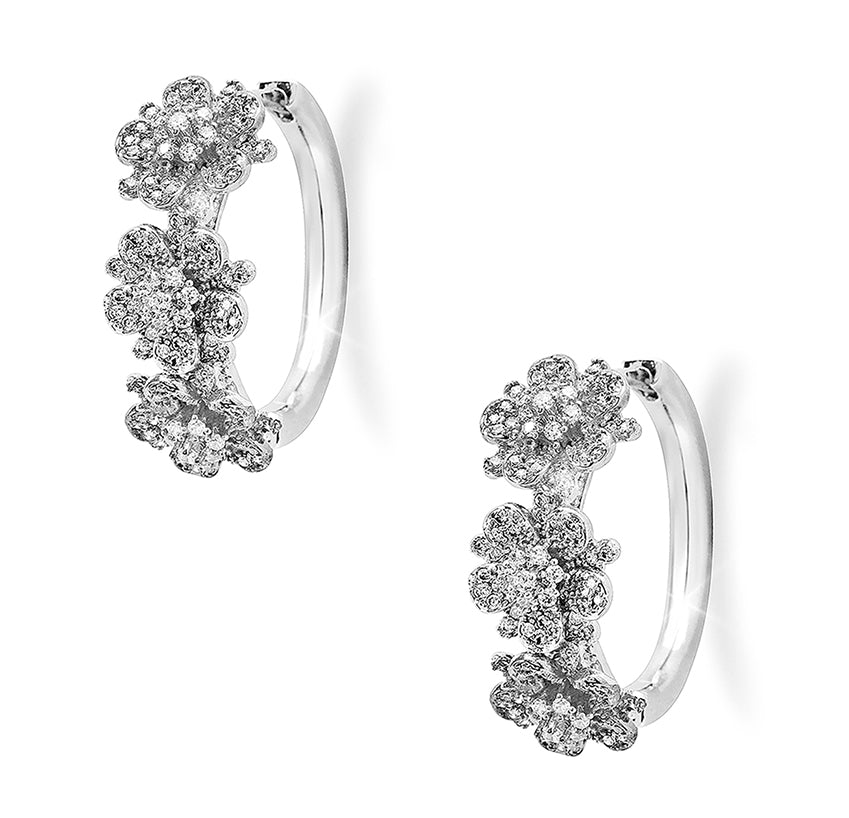 Utilizing the innovative "blank and bloom" technique, these earrings unveil a hidden world of intricate details through their open front. The meticulously crafted bio-mimicry motif, inspired by nature's artistry, makes a bold statement, showcasing the power of design that imitates life. Adorned with stones, forged in fire, these hoops break the mould and challenge traditional jewellery pairings.