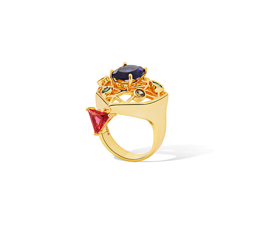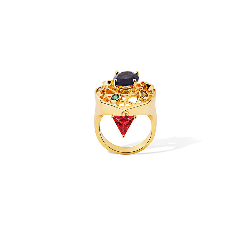 The ring reflects the precision of European design, giving emphasis to the meticulously detailed form crafted in 18K gold plating. Fire-birthed stones nurtured and arranged with confident precision against the architectural form echoes the Victorian inspiration. More than an accessory, the Garth Golden Ring is a modern heirloom, bearing the distinctive Shazé design signature. The un-seen piece is designed for statement ensembles.