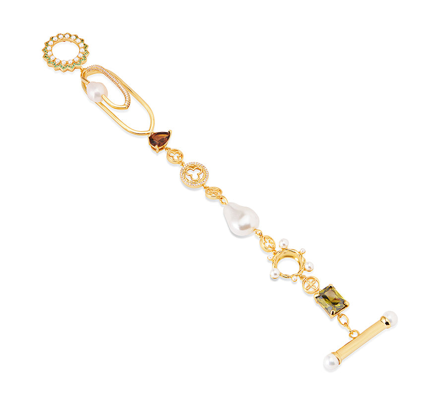 A design out-of-the-ordinary, the Menagerie Golden Bracelet from the Everywhere I Pose Collection by Shazé features a masterful mix of multi-materials.