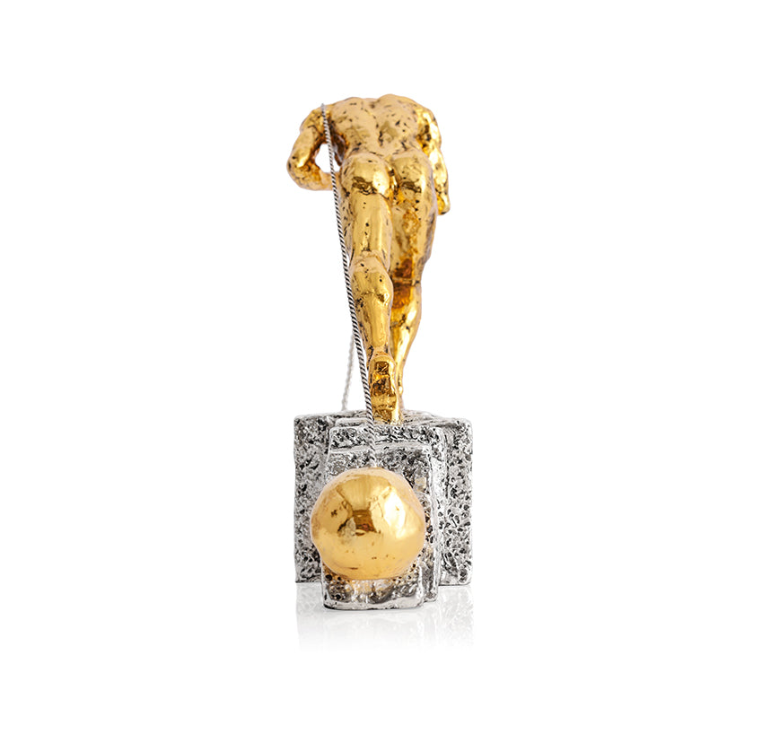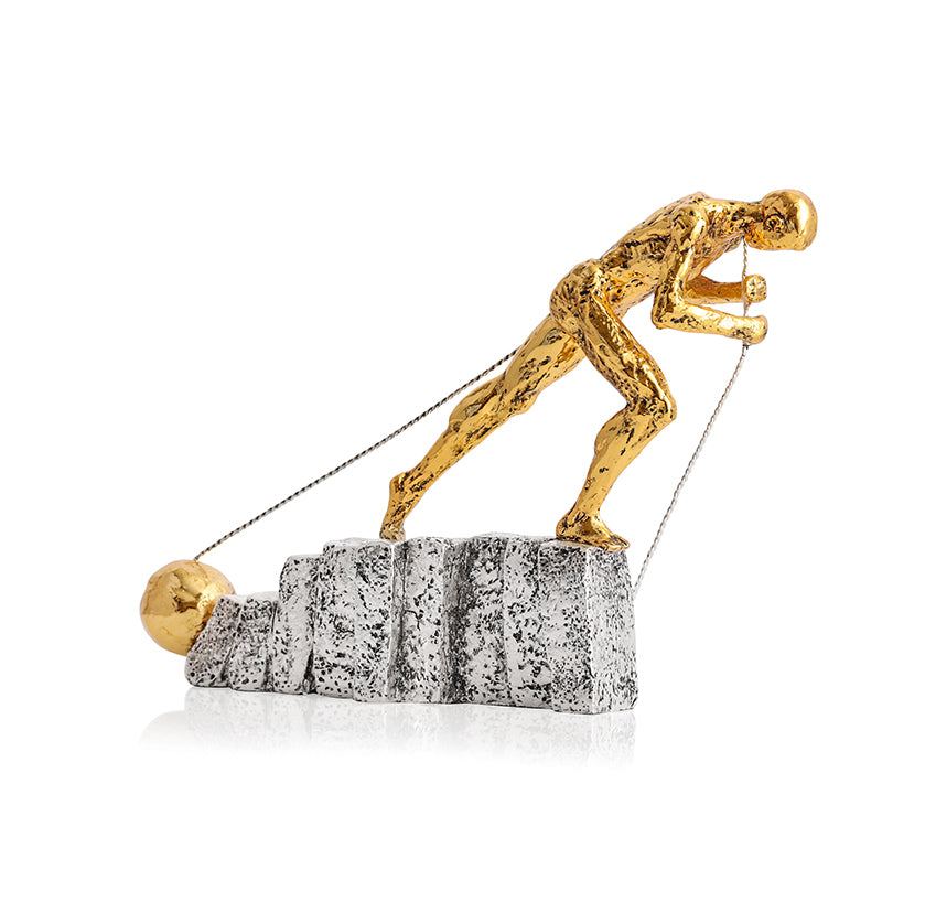 Witness determination and strength, encapsulated in this silver & golden piece of a man pulling heavy slabs with all his valor. The lustrous sheen of silver accentuates the delicate textures and contours. The base, textured to resemble stone, signifies trials in the walk of life. While the gold hue empahsizes the man's gusto.