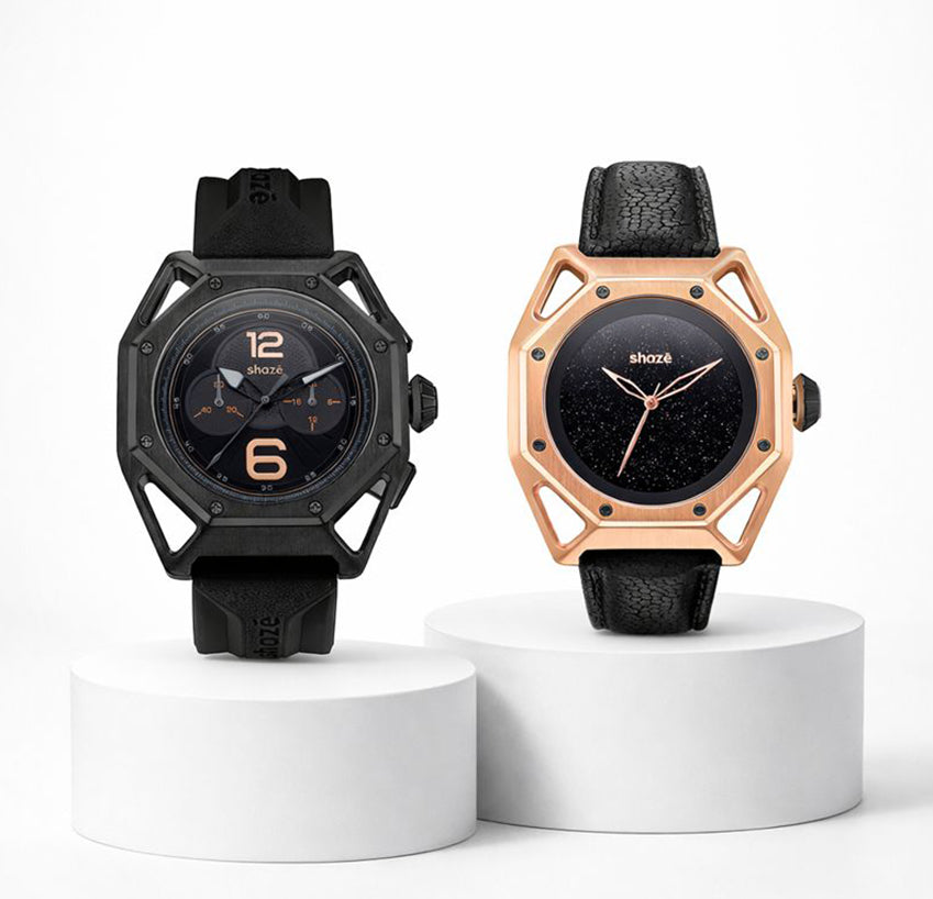 The women’s black timepiece and the men’s black chronograph express a refined midnight aesthetic. Shazé’s signature precision-crafted lugs define the octagonal case with architectural strength.