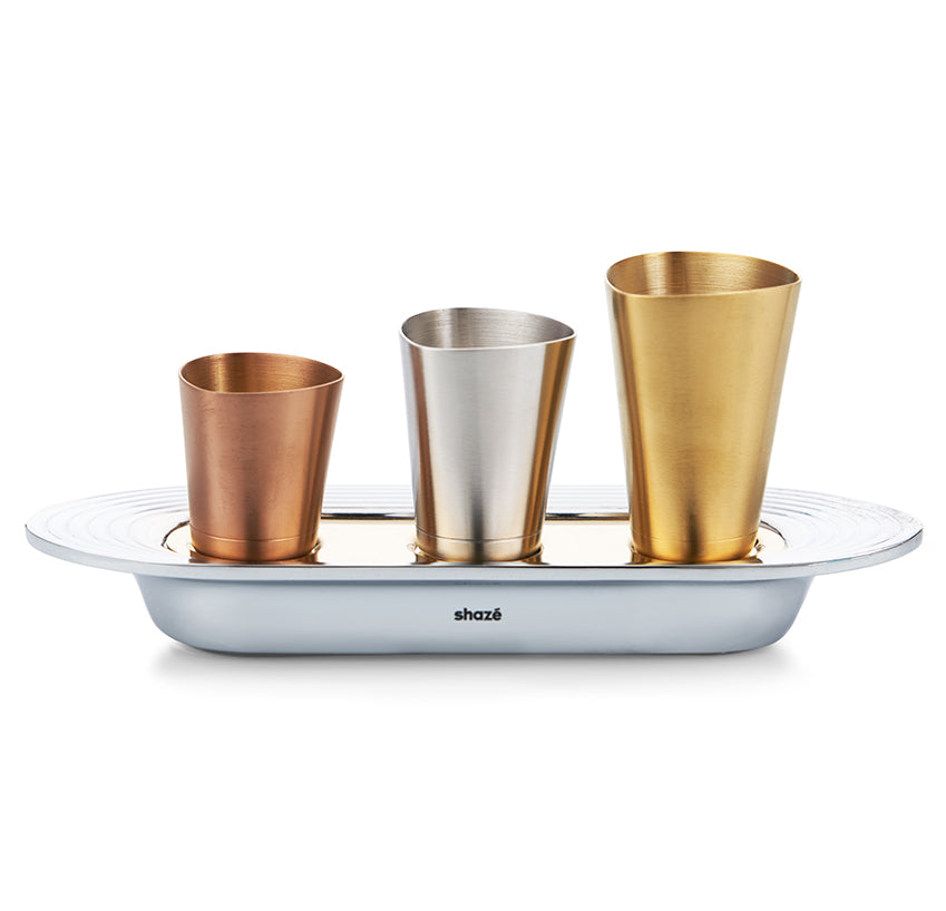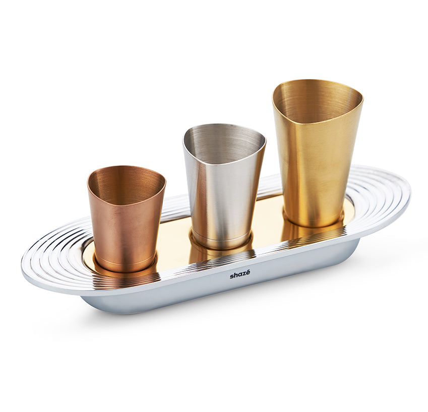 The Quantum shot measures come in the Shazé-signature trichoid shape. The distinguished medallists echo a sweeping finish on their gold, silver and bronze frames. Each measured up to match master mixology skills.