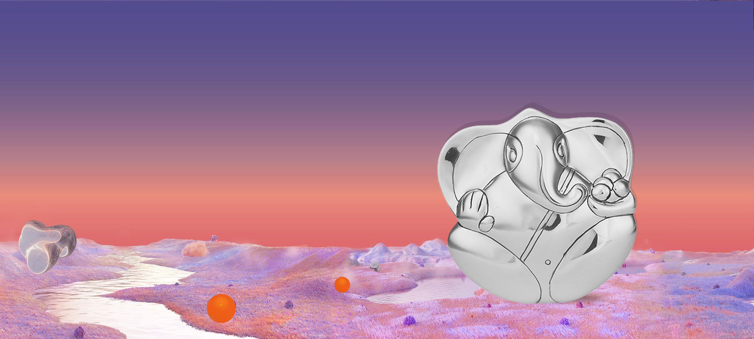 This seated Ganesh shines bright with the high-gloss of electroformed silver. Cast in resin for its malleability, each intricate curve and undulation truly depicts the energy of this piece. The circular base is ingeniously engineered to allow the figurine to rock gently, inspiring a kinship with the one who rocks him.