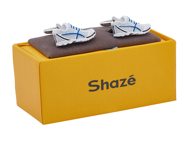 Designed with an iconic Shazé quirk, the Runner cufflinks are a statement of enthusiasm and adventure.The white shoe design is highlighted with detailed black and blue design lines across the frame. A modern take on men's accessories, here's a pair of cufflinks that's designed to stand out more than fit in.