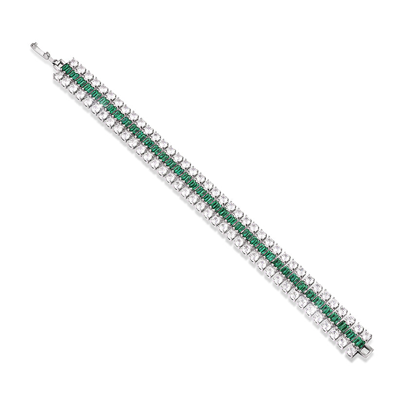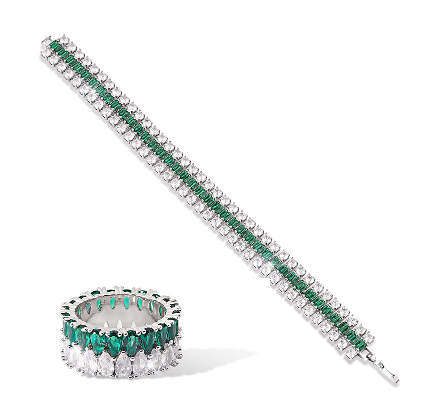 Attention to detail is given emphasis in the un-seen arrangement of stones and tells a story of meticulous craftsmanship. The celebration-like charm sparkles through the achromatic and emerald-like hued stones. Structured in a copper frame, the material is a testament to the design’s durability and antimicrobial prowess. Designed to revise dressing rituals, the bracelet and ring set the tone of your ensemble for any event.