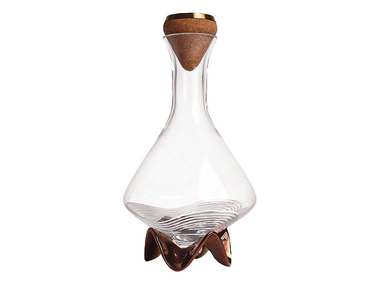 The lead-free frame of the decanter is broadened at the bottom to balance every pour. The seemingly weightless decanter creates its illusion through its balletic base which rests atop its reflective wave-like base. We bring back the detailed gloss zamac topper with its cork stopper that coherently fits into the sleek neck.