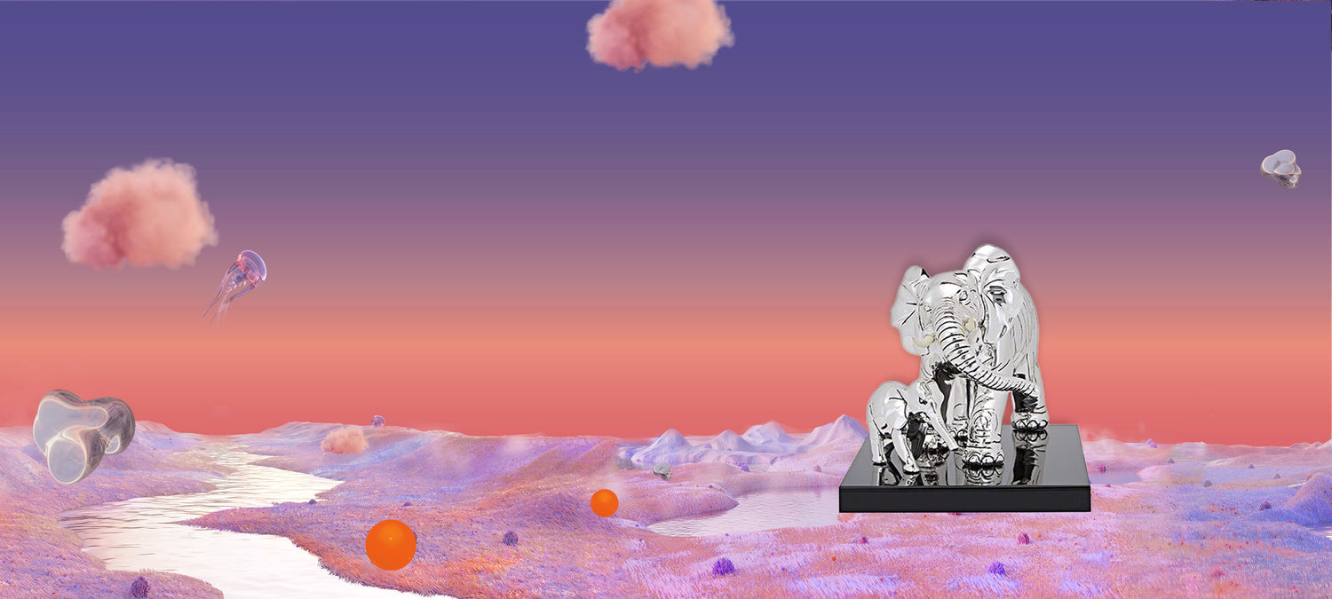 Tenderness and strength, captured in time with this silver-coated piece of a majestic Elephant and its Calf. The harmonious composition of this piece evokes a sense of admiration. While the silver sheen radiates the emotion. Crafted with high-grade material to deliver details and a form that reflects the animal's innate playfulness.