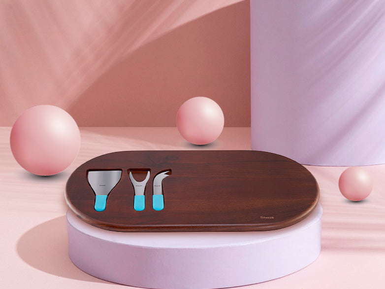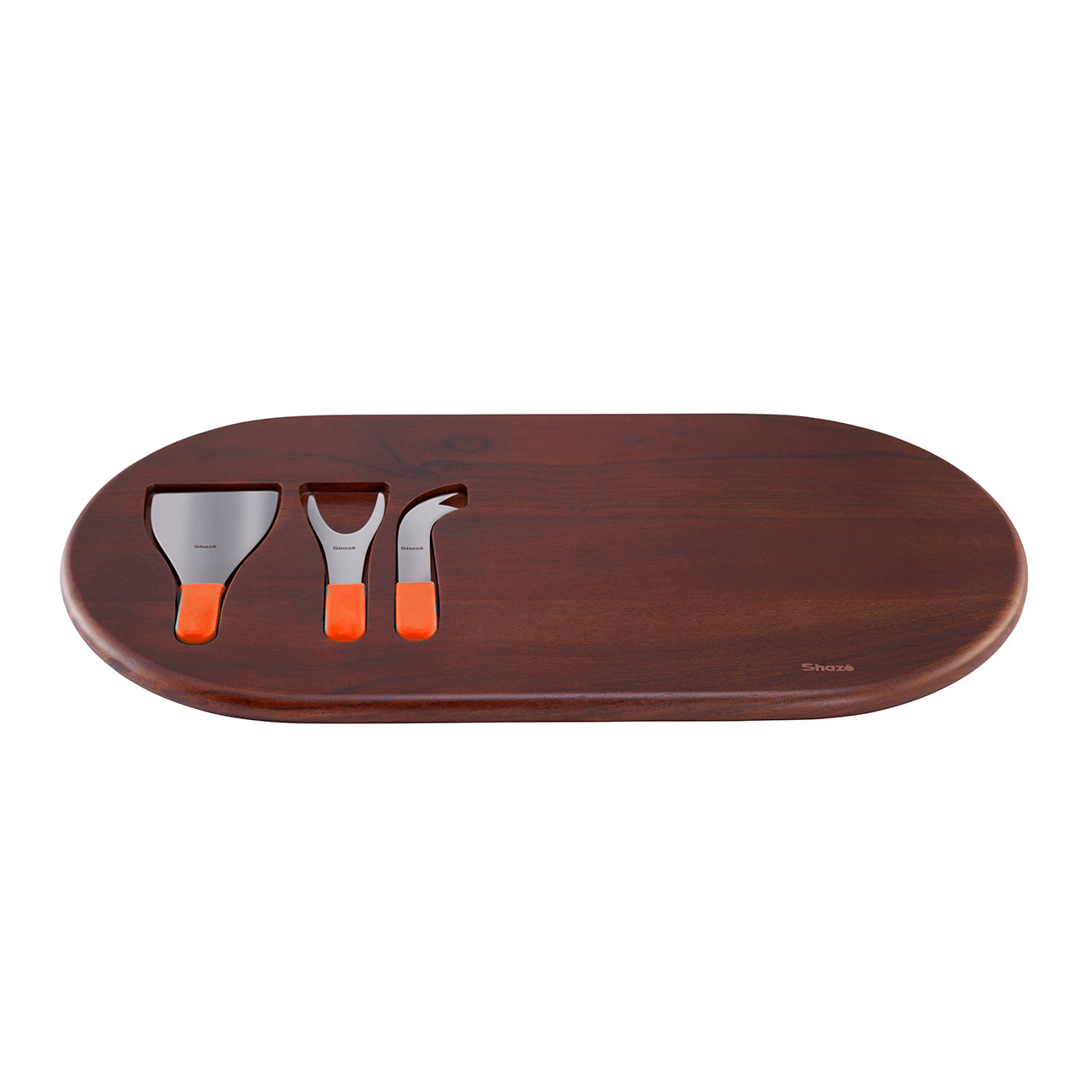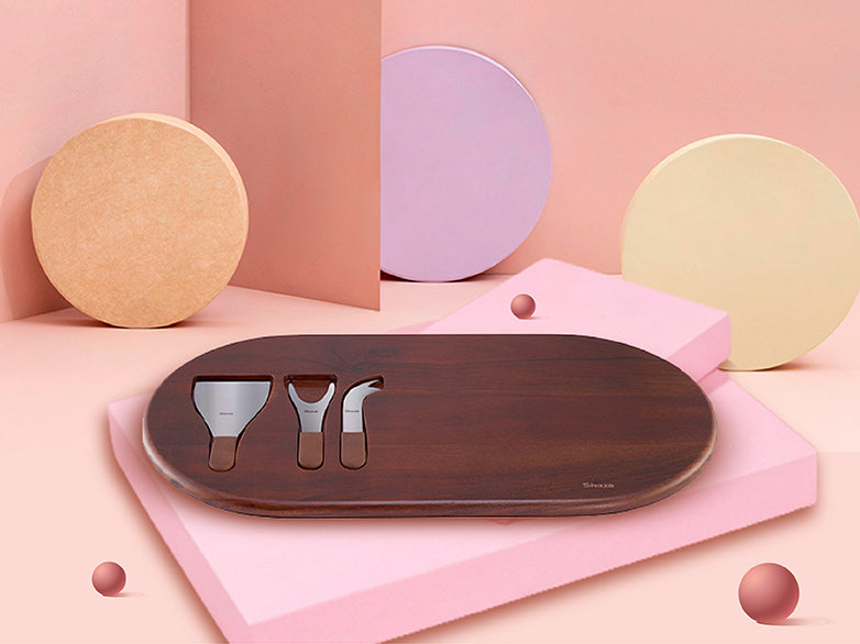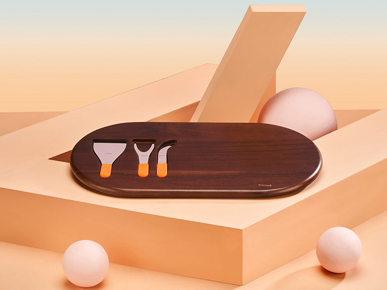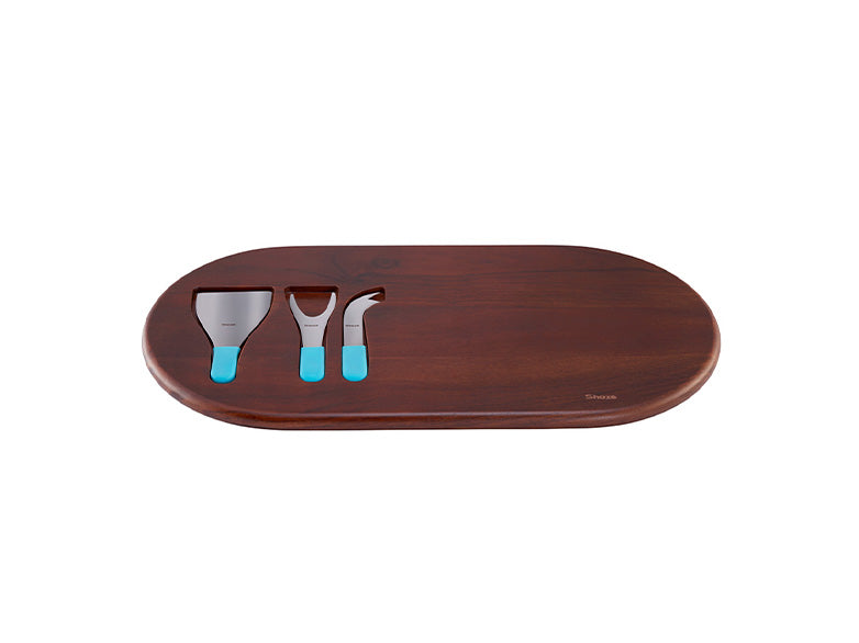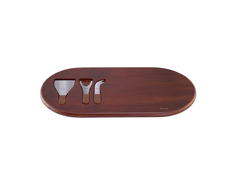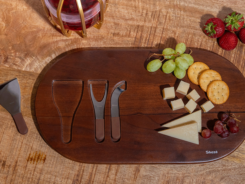 No time for cheesy lines, here’s a simple statement for your cheese tasting events. Made for elaborate arrangements as three cheese knives find their groove in the recesses of the Acacia wood.