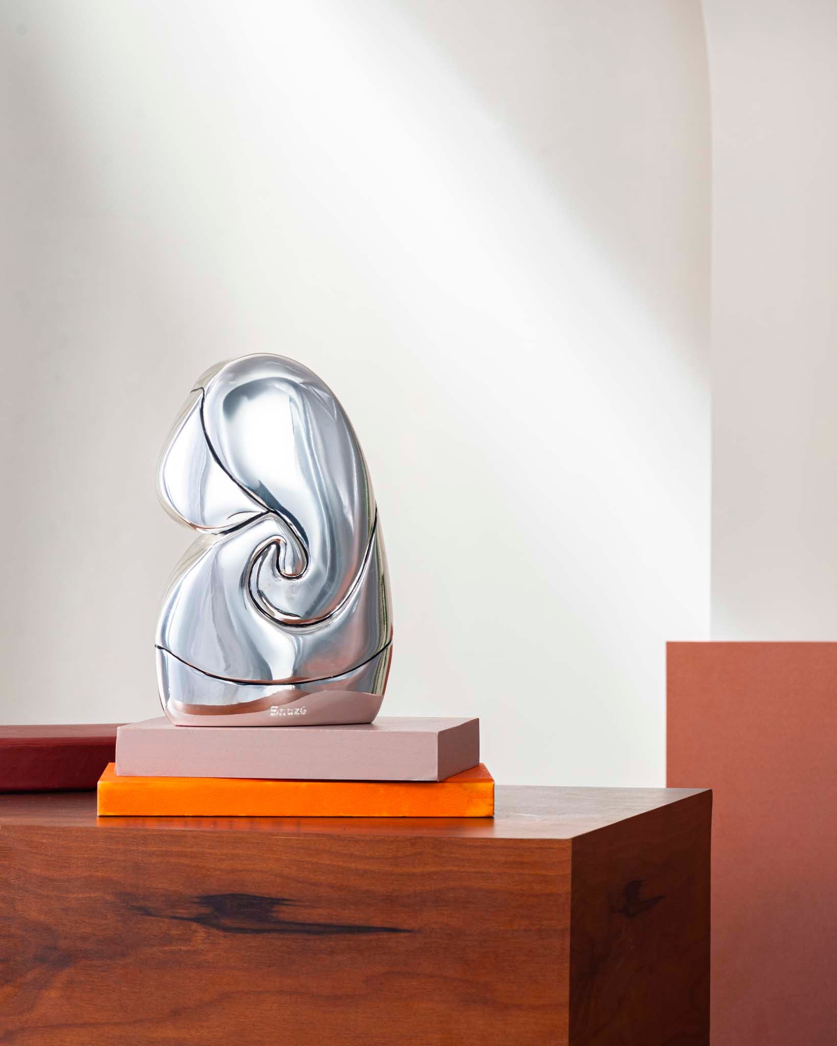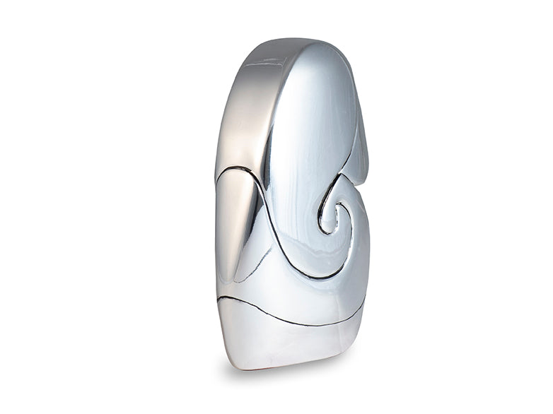 An artistic tribute to the remover of obstacles, this silver chrome Ganesha redefines traditional iconography through bold abstraction. Polished to a mirror finish, the god sculpture captures light and reflection, symbolizing Ganesha’s eternal presence across evolving forms. Its flowing silhouette brings visual serenity and philosophical depth.