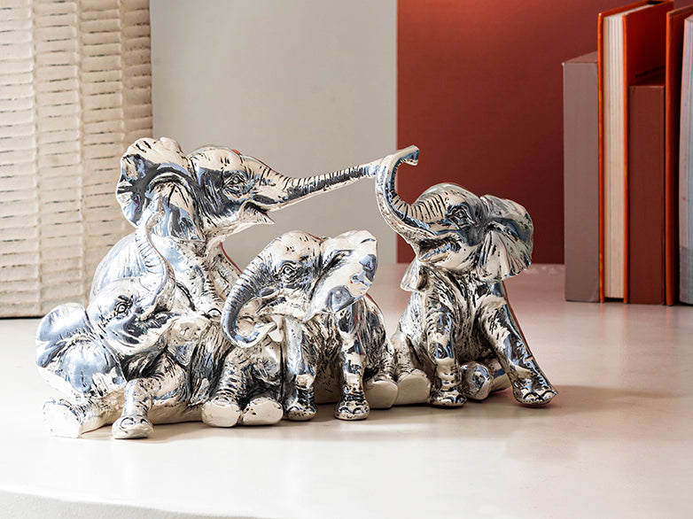 Tusklets is an elephant figurine that captures playful charm in polished silver. Featuring four baby elephants mid-frolic, this silver-toned animal idol is a joyful celebration of connection and innocence in luxury decor.