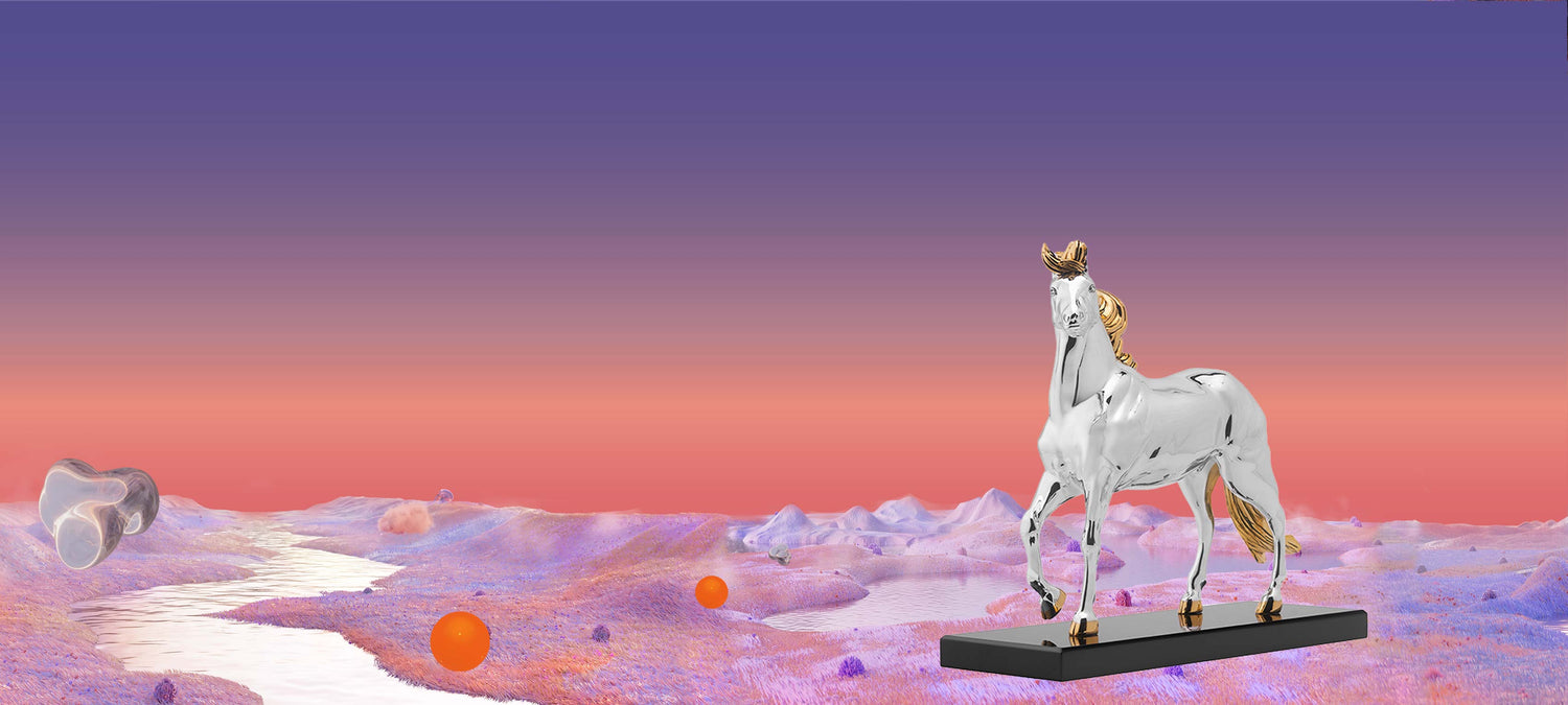 A spirited stallion frozen in mid-stride, this piece stands for agility and strength. Adding to its allure, this figurine glistens with silver finishing and fine craftsmanship. Whether displayed in a grand entrance hall, or a tastefully curated living room space, this piece embodies the essence of prestige and brings heartiness with it.