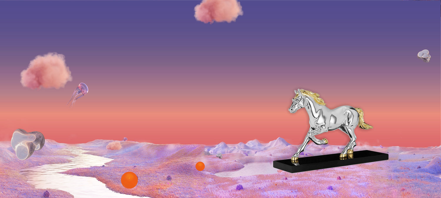 A spirited stallion frozen in mid-stride, this piece stands for agility and strength. Adding to its allure, this figurine glistens with silver finishing and fine craftsmanship. Whether displayed in a grand entrance hall, or a tastefully curated living room space, this piece embodies the essence of prestige and brings heartiness with it.