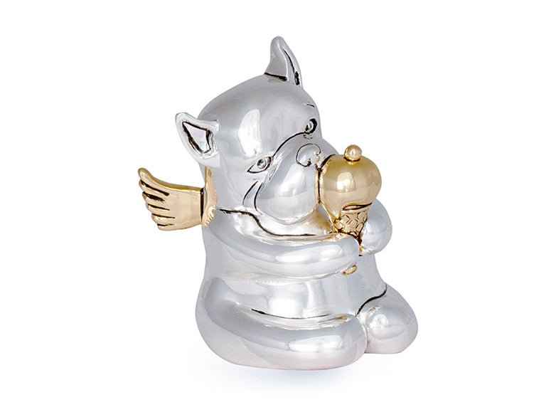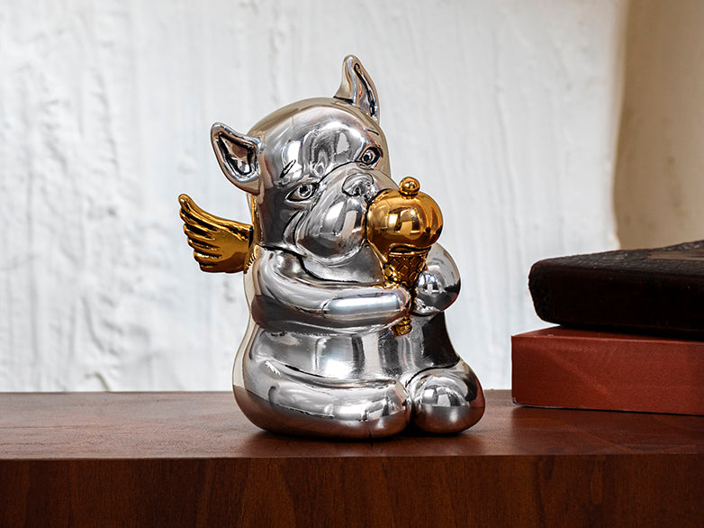 Meet the rebel of home décor, a silver chrome Frenchie with golden wings and a tempting gold ice cream, where surreal meets statement. This chrome collectible blends bold design with playful indulgence, turning joy, curiosity, and attitude into an iconic presence.